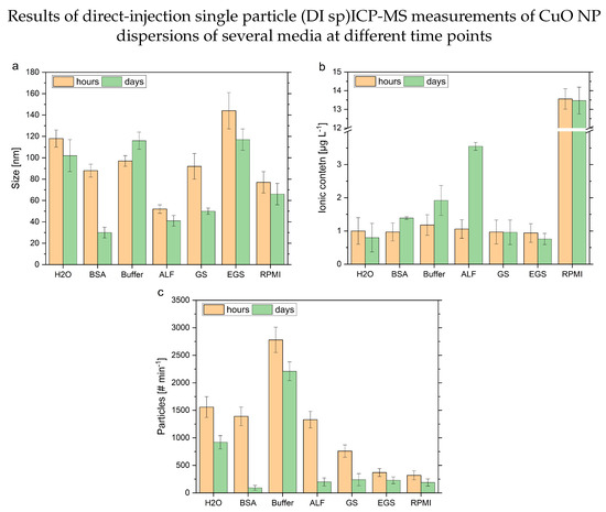 Accordingly, the particulate content decreases after 8 h significantly. Due to the sample preparation approach in combination with the ICP-MS characterization, these results reflect different processes compared to the DLS measurement. The internal comparison and interpretation of the time-resolved data allow for a more detailed look into the individual measurements of the different media (see Figure 3). This is possible due to the lower individual uncertainties at the respective time points compared to the DLS measurements.