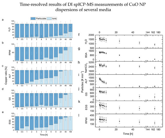 Time-resolved results of the measurements of solutions of CuO NPs (1.0 µg L, n = 3) in different media: On the left-hand side (a–e) is the copper content based on the particulate values determined by the 3 approach, and on the right-hand side (f–l), the observed particle numbers.