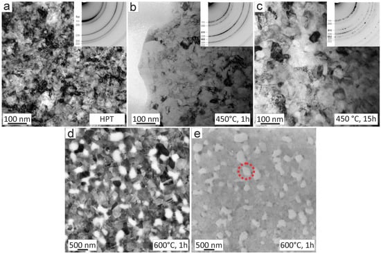 Overview of the investigated microstructures. (a) SPD-processed state by HPT. (b) Annealed specimen at 450 °C for 1 h. (c) Annealed specimen at 450 °C for 15 h. (d) Annealed state at 600 °C for 1 h investigated with SEM using a back-scatter electron detector. (e) Annealed state at 600 °C. Same position as in (d) using a secondary electron detector. One example of the additional phase is marked with a circle. Please note that (a–c) are TEM brightfield images whereas (d,e) is made with SEM.
