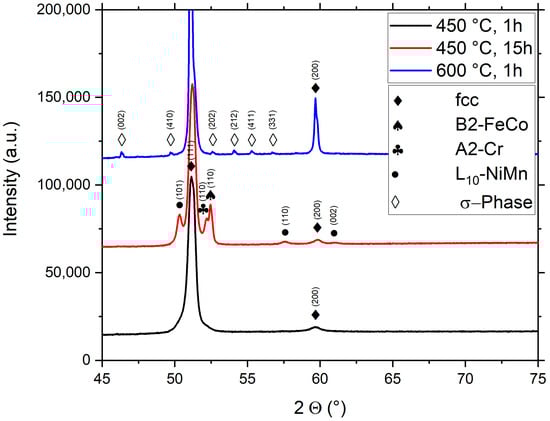 The crystallographic phases are further investigated with the XRD data shown in Figure 2. While it has been established via atom probe tomography measurements that in NC samples, 1 h of annealing at 450 °C leads to the formation of second phases [7], their volume fraction is not large enough to be visible via XRD measurements; see Figure 2. However, prolonged annealing at 450 °C for 15 h leads to a significant formation of second phases. The phase decomposition results in the formation of a microstructure with four different phases, which can be inferred from the corresponding XRD pattern. Due to the limited number of peaks, some of these phases cannot be unambiguously identified from the diffractograms; however, their presence is indicated in the diffractograms in combination with knowledge documented in other experimental studies [5,6,8]. These four phases are the original high-entropy phase with an fcc crystal structure, an A2-phase (Cr-rich), a B2-phase (FeCo-rich), as well as an L10-phase (NiMn-rich). After annealing at 600 °C a multi-phase microstructure has formed, consisting of the high-entropy fcc phase and a σ-phase.