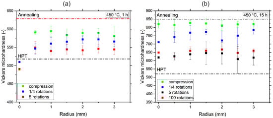 The sample annealed for 15 h at 450 °C shows a similar behavior; see Figure 3b. The initial hardness is significantly higher, 852 ± 8 HV1. As a result, the sample is fairly brittle, which leads to crack formation during HPT deformation. Therefore, large deviations in hardness across the radius are present. Nonetheless, the same trend as in the 1 h sample can be observed: Upon deformation, the hardness of the sample decreases and then plateaus even after 100 rotations.