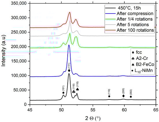 Figure 4 depicts XRD measurements of the deformed materials after 450 °C, 15 h of annealing, and subsequent deformation. The 450 °C, 1 h annealing state is not shown, since even in the annealed state, no XRD signal from the second phases could be found (Figure 2). During HPT deformation, peak broadening occurs due to the abundant formation of lattice defects, which cause an overlap of the B2-FeCo and the A2-Cr phases. From the peak intensities, it is clear that even under the most severe deformation condition of 100 rotations in the HPT, full re-dissolution of the second phases has not been achieved.