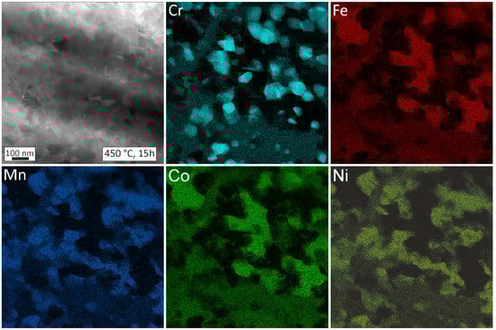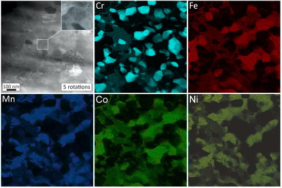 In Figure 5, STEM images of the 450 °C, 15 h state after annealing can be seen combined with elemental maps indicating the elemental distribution of Cr, Mn, Fe, Co, and Ni, respectively. Especially, Cr, Mn, and Fe are of interest as they represent the main constituents of the second phase. In Figure 6, STEM images of the same annealed state (450 °C, 15 h) but additionally deformed for 5 rotations are presented. The elemental mappings allowed for a quantitative analysis of the phase distribution; these results are summarized in Table 1. For that, a Ni-Mn phase was assigned if Mn was larger than 35% (the same result is obtained if the condition is Ni > 35%). A Fe-Co phase was assigned if Fe > 35% (almost the same result is obtained if the query is Co > 35%). The Cr-rich phase (A2-Cr) was assigned if Cr > 40%. Surprisingly, unlike what was reported in reference [10], the re-dissolution after HPT deformation of the annealed samples is minimal. However, some microstructural changes are nonetheless visible; the microstructure after deformation is more blurry, which is due to the reintroduction of non-equilibrium grain boundaries [17,18]. Furthermore, in the STEM image (Figure 6), deformation twins can be seen induced by plastic deformation.