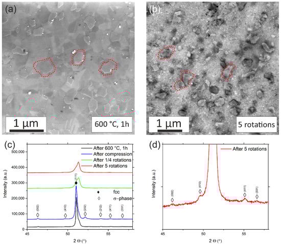 (a) BSE micrograph of the annealed 600 °C, 1 h specimen. (b) Microstructure after deformation for 5 rotations. For clarity some examples of the σ-phase are marked in both images in red (c) XRD data of the as-annealed state and after deformation. (d) detail of the XRD-data of (c) after 5 rotations. It can be seen that the σ-phase is still present after deformation.