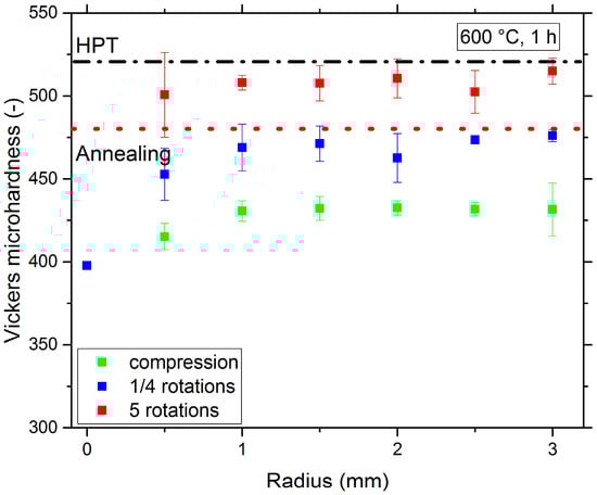 Regarding the mechanical response, see Figure 8, the initial hardness of 480 ± 3 HV1 after annealing at 600 °C, 1 h, is lower than in the HPT-deformed material, which is due to the onset of grain growth for this temperature. When subsequently compressive strain is applied, the hardness of the samples decreases further to 425 ± 8 HV1. This phenomenon can be explained by the reversal of the so-called “hardening by annealing” effect [19].
