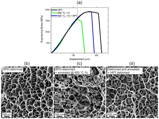 Tensile tests of the NC, the 600 °C, 1 h heat treated and the annealed and deformed sample (5 rotations) (a). Representative fractographs of the SPD-state (b), the annealed state at 600 °C for 1 h (c) and additionally deformed material state (d).