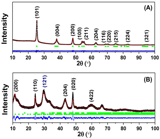 Refined X-ray diffractograms are presented in Figure 1 for TiO2 NPs (A) and TiO2 NWs (B). The refined X-ray diffractogram of commercial TiO2 NPs, Figure 1A, consists of the reported polymorph phase of TiO2, anatase, synthesized by sol-gel method assisted with heat treatment [24]. The corresponding Bragg’s angle positions for crystalline identified phases are given in Table S1.
