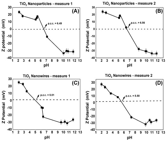 The p.z.c. is the pH value corresponding to a null zeta potential value [35], or also understood as an electrical surface potential equal to zero (shear plane model). At lower pH values (below p.z.c.) it is positively charged, while at higher pH (above p.z.c.) it is negatively charged [35]. As reported by Calle et al. the p.z.c. of TiO2 (anatase 70% and rutile 30%) was found to be 6.5, whilst doped TiO2 samples have a low p.z.c. [36]. This value of 6.5 is equal to that found with our titration experiment, see Figure 3A,B, also 6.5, for anatase TiO2 NPs. However, for compounds that have impurities, the p.z.c. is less than 6.5. This may be the reason that the mean p.z.c. for the TiO2 NWs sample is 5.3, see Figure 3C,D, since it is a biphasic sample (brookite and protonic trititanate).