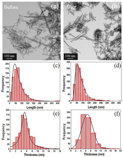 (a) TEM image of the TiO2 NWs before the ecotoxicity experiment, (b) TEM image of the TiO2 NWs after the ecotoxicity experiment. (c) Log-normal distribution of the TiO2 NWs length measurements before the experiment of ecotoxicity and (d) log-normal distribution of the measurements of the length of the TiO2 NWs after the ecotoxicity experiment. (e) Lorentz distribution of the measurements of the diameter of the TiO2 NWs before the ecotoxicity experiment and (f) normal distribution of the measurements of the diameter of the TiO2 NWs after the ecotoxicity experiment.