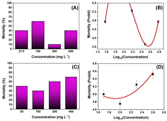 As previously mentioned, 10 neonates of D. magna for concentration were used for 24-h LC50 determination. Modified Probit analysis was used to calculate the 24-h LC50 for TiO2 samples. Figure 6A,C show mortality (%) as a function of concentration (mg L−1) for both TiO2 samples.