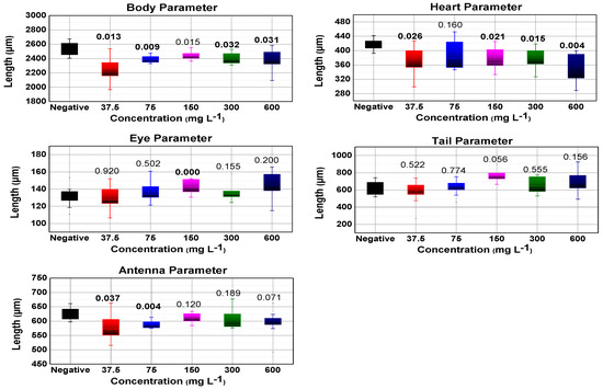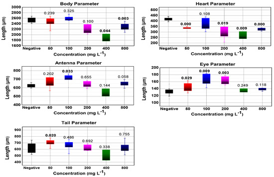Boxplot for all morphological parameters (tail, body, heart, antenna, and eye) measured after TiO2 NPs exposure. Numbers above boxes are their p-values, with those written in bold numbers indicating significance (p-value < 0.05).