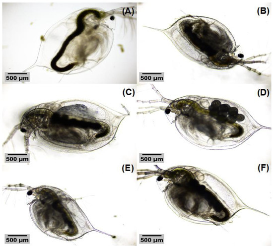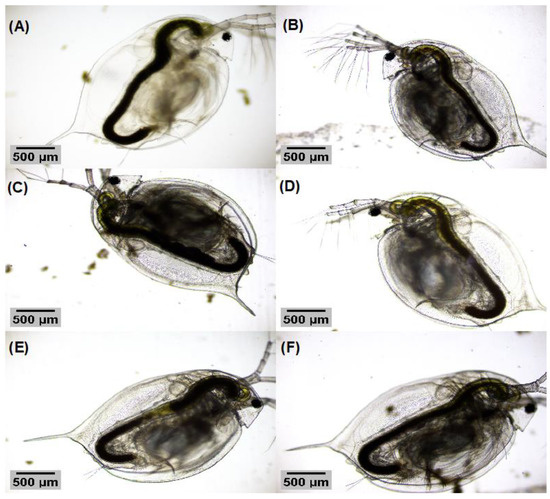 (A) D. magna individual from the negative control, (B) D. magna individual exposed to 37.5 mg of TiO2 NPs, (C) D. magna individual exposed to 75 mg of TiO2 NPs, (D) D. magna individual exposed to 150 mg of TiO2 NPs, (E) D. magna individual exposed to 300 mg of TiO2 NPs, and (F) D. magna individual exposed to 600 mg of TiO2 NPs.
