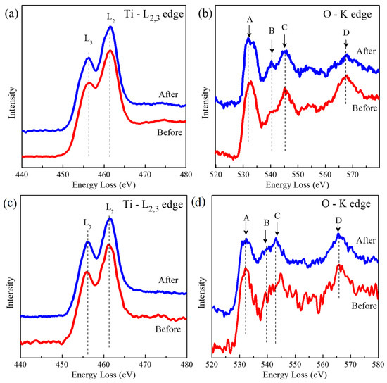 (a) Ti-L2,3 edge and (b) O-K edge in the EELS spectra for before and after TiO2 NPs. (c) Ti-L2,3 edge and (d) O-K edge in the EELS spectra for before and after TiO2 NWs. The upper letters (A, B, C, and D) indicate the characteristic energy loss positions (eV).