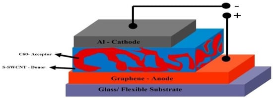 Figure 1 shows a structure that blends two semiconducting materials, a donor (SWCNT) and an acceptor (C60 fullerene), with distinct band gaps positioned between two electrodes (graphene, 5.3 eV anode, and aluminum, 4.2 eV cathode), to form a junction that aids in charge separation of excitons [43,46,47,48,49,50].