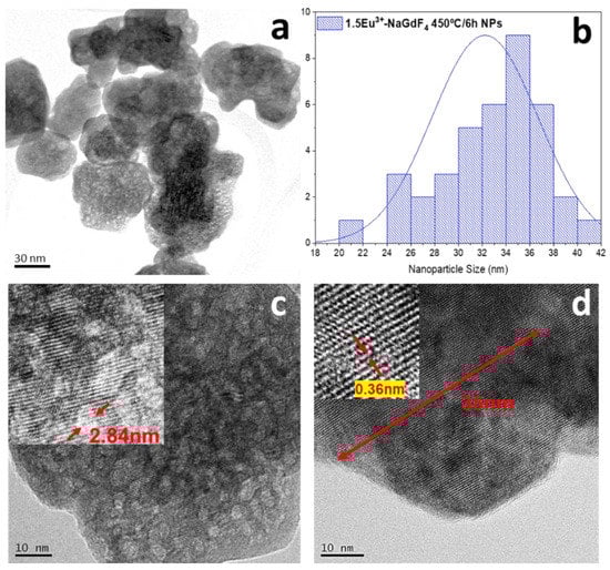High-Resolution Transmission Electron Microscopy (HRTEM) was used to characterise 1.5Eu3+: NaGdF4 NPs heat-treated at 450 °C for 5 h. The powder was re-dispersed in ethanol and then dripped onto a carbon-coated copper grid (Lacey Carbon, LC-200-Cu 25/pk). HRTEM images were taken with a HRTEM-JEO 2100 microscope, and the particle size distribution was determined through ImageJ® software, using a maximum of 10 images. The lattice parameters of NaGdF4 were determined using the Image-J source.