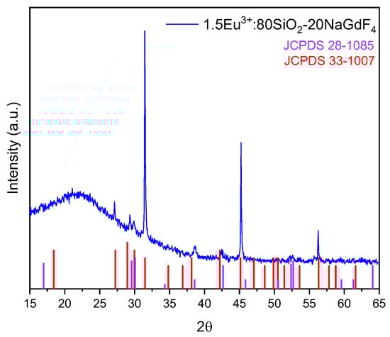 Figure 3. XRD pattern of OxGCs with the composition 80SiO2-20(1.5Eu3+: NaGdF4) heat-treated at 450 °C for 5 h.
