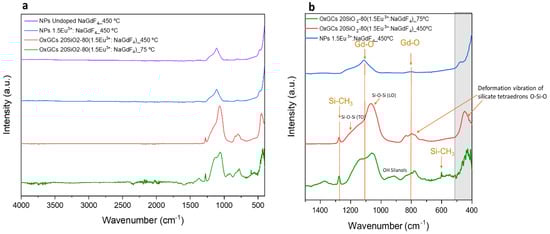 Figure 4. (a) FTIR spectra from 4000 cm−1 to 450 cm−1 of undoped NaGdF4 NPs, 1.5Eu3+: NaGdF4 NPs (violet and blue line, respectively) and OxGCs with the composition 80SiO2-20(1.5Eu3+: NaGdF4) dried overnight at 75 °C and heat-treated at 450 °C for 5 h (red and green line, respectively) and (b) FTIR spectra recorded from 1500 to 400 cm−1 of 1.5Eu3+: NaGdF4 NPs and 80SiO2-20(1.5Eu3+: NaGdF4) OxGCs with the composition (blue, red and green line, respectively).