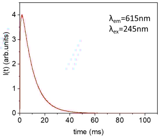 The experimental decay curve from the 5D0 level was obtained by exciting at 245 nm through the CTB and collecting the luminescence of the 5D07F2 transition at 615 nm. The decay curve, displayed in Figure 6, shows a rise time of 0.44 ms, due to the population of the 5D0 level from higher energy levels, followed by a single exponential decay with a lifetime of 9.6 ms. This lifetime value is longer than some of those reported for hexagonal nanoparticles with the composition Eu3+: NaYF4 or Eu3+: NaGdF4 [59,60,61] and is similar to that found by Karbowiak et al. for Eu3+: NaGdF4 nanocrystals [62].