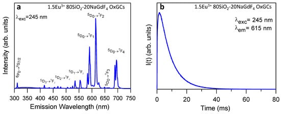 The luminescent properties of the OxGCs powders with the composition 80SiO2-20(1.5Eu3+-20NaGdF4) heat-treated at 450 °C for 5 h are presented in Figure 7a, which shows the emission spectrum recorded under excitation at 245 nm. The spectral features are similar to those obtained for 1.5Eu3+: NaGdF4 NPs, with the peaks revealing the transition 6P08S7/2 of Gd3+ and the 5D07FJ transition from the Eu3+ ion. In addition to the nanoparticles study, the most intense peak was found to be corresponding to the 5D07F2 transition, in agreement with a non-centrosymmetric site for the Eu3+ ion. In this case, the calculated R-value is also 1.46, which is similar to that of the NPs. Furthermore, the wavelength of the emissions is the same as that detected for the nanoparticles reported in the previous section.