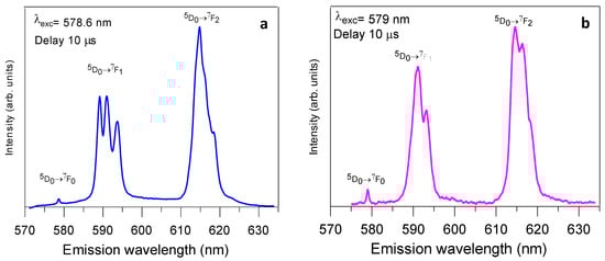 Figure 8. Time-resolved fluorescence line-narrowed emission spectra of the 5D07F0,1,2 transitions of Eu3+ ions measured at 9 K at a time delay of 10 µs after the laser pulse under an excitation at (a) 578.6 nm and (b) 579 nm, respectively, for the 80SiO2-20(1.5Eu3+: NaGdF4) powders heat-treated at 450 °C for 5 h.