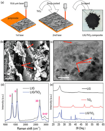 (a) Step by step fabrication of LIG/TiO2 composite; (b) SEM image showing surface morphology of LIG/TiO2; (c) TEM image of LIG/TiO2 composite; (d) Raman spectrum of both LIG and LIG/TiO2 showing D, G, 2D and D+D’ peaks; (e) X-ray diffraction (XRD) patterns of LIG, TiO2, and LIG/TiO2.