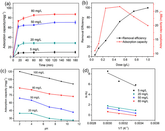 (a) Adsorption capacity versus contact time for various initial MO concentrations at T = 298 K; (b) effect of increasing dose of adsorbent on removal efficiency and adsorption capacity; (c) Effect of pH on the adsorption capacity of LIG/TiO2; (d) plots of LnKc versus 1/T for the adsorption of MO on LIG/TiO2 at different dye concentrations.