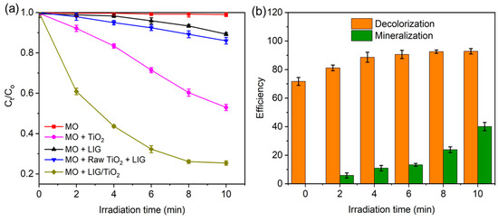 (a) Removal efficiency of MO using different catalysts (photocatalysis contribution only) at T = 298 K, P = 1 atm; (b) comparison removal efficiency and mineralization performance by LIG/TiO2 for an initial concentration (Co) of MO = 20 mg/L at standard conditions.