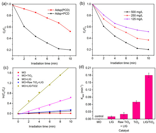 In light of the adsorption capability of the LIG/TiO2 composite catalyst, photocatalytic effects were studied. Photocatalytic oxidation reactions can use specific photon energies or a range to break down a pollutant. The rate of photocatalytic oxidation for a dye depends on its concentration, water system characteristics, and catalyst dosage. The photocatalytic activity of LIG/TiO2 was thus evaluated using MO, using UV light (365 nm), and was quantified by monitoring the decolorization of the dye. LIG/TiO2 was compared in batch mode with the following control materials: TiO2 only, LIG only, and the mixing of raw, unlased TiO2 and LIG at T = 298 K, Co = 20 mg/L, catalyst dose = 500 mg/L (Figure 6a).