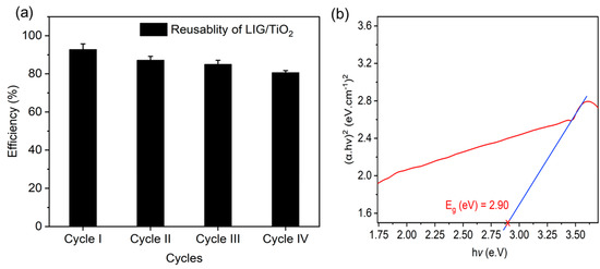 (a) The reusability of the LIG/TiO2; (b) band gap energy (Eg) calculation using Tauc plot. The linear line is extrapolated to the x-axis and the band gap identified using an average of four fits.
