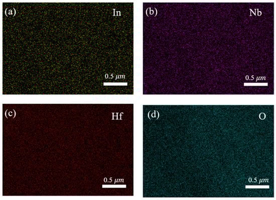 To demonstrate that In and Nb elements are doped into the HfO2 lattice, we performed elemental mapping of In, Nb, Hf, and O as shown in Figure 7a–d, respectively. It can be seen from Figure 7 that In and Nb as doping elements show good uniformity in the maps. Therefore, we believe that In and Nb elements are successfully doped into the lattice of HfO2.