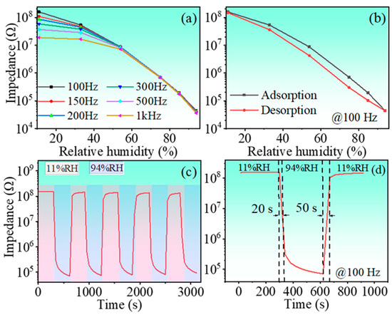 The repetitive behavior of the sensor is shown in Figure 8c. Sensor repeatability was achieved by alternating cycles of 5 times between RH = 11% and RH = 94% environments. In each environment, the sensor is exposed for 300 s to adapt to the change in ambient humidity. The sensor switching time between different humidity environments is negligible compared to the 300 s of exposure in each environment, because the switching is done in a very short time (roughly 1 s). According to the test results, we found that the impedance of the sensor remains basically stable, so it can be concluded that the sensor has good repeatability. The recovery/response characteristics of the sensor were measured by placing the sensor in alternating 11 and 94% humidity environments with a duration time of 5 min in each humidity environment. The response–recovery curve is shown in Figure 8d. The response/recovery time is the time required for the impedance change to reach 90% of the total impedance change during adsorption/desorption process. The response/recovery time of the sensor is found to be 20/50 s, indicating that the sensor has good recovery–response behavior. Compared with the adsorption process, the desorption time is longer, which is due to the higher moisture-sensitive response of adsorbed water molecules and the surface of the sensor material as well as the higher binding energy. In addition, the adsorption process of water molecules is an exothermic process, while the desorption process is a heat absorption process requiring external energy to make water molecules escape from the sensor surface. In addition to the above factors, the hysteresis factor is also related to the amount of sensing material and the diffusion rate of water molecules [46,47].