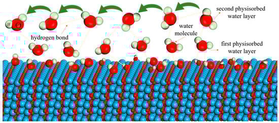 Due to the electrostatic effect of OH− groups, more and more water molecules are physically absorbed to form a continuous water layer [51]. The formation of a continuous water layer can facilitate the combination of water molecules and OH− groups to form H3O+ and, at the same time, H3O+ can also generate H+ and H2O.