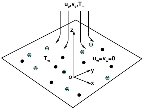 There are many references on stagnation point flow, some of which are given below. Ariel [31] studied the two-dimensional stagnation-point flow problem of non-Newtonian liquids. Mahapatra et al. [32,33] considered the steady stagnation flows of viscoelastic liquids on the stretched boundary, and obtained similar solutions of the stagnation flows of magnetic fluids. Weidman [34,35] investigated a modification of Homann’s axisymmetric stagnation-point flows, and compared it to a rigid plate so that it was non-axisymmetric. By applying the homotopy analysis method, Nawaz et al. [36] studied radially stretched thin plates causing laminar boundary layer flows of nanofluids, considering thermophoresis and Brownian motion. Azam et al. [37] numerically studied the unsteady magnetic fluid stagnation-point flows of Carreau nanofluids on the expansion/contraction cylinder under the action of nonlinear thermal radiation, taking into account the condition that the mass flux of nanoparticles at the boundary of the Buongiorno model is zero. Ahmed et al. [38] considered rotational stagnation flows of Maxwell nanofluids in porous rotating disks. Modified Buongiorno nanofluid models were used to investigate the effects of variable thermal conductivities and heat sources on heat transfer characteristics. On porous stretched/contracted plates, Kho et al. [39] studied two-dimensional Hermann stagnation-point flows and heat transfer of hybrid nanofluids. Numerical analysis of hybrid nanofluid flows in porous media in a non-axisymmetric stagnation region was conducted by Waini et al. [40].