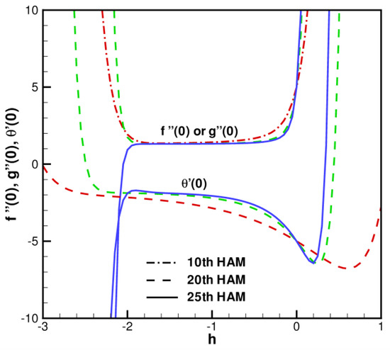 Based on the HAM results, Cu-Al2O3-H2O spherical hybrid nanoparticles for Homann stagnation-point flows of flat sheets in porous media are solved approximately and analytically. The convergence control parameter h and auxiliary parameter β in the series Solution (35) ensure the convergence of order solutions. By examining the curves of the control parameters, we are able to determine the optimal range for the auxiliary control parameter, which is crucial to ensuring that the series solution converges. Therefore, if the series Solution (35) is converging, it follows that the derivative must also be converging. In order to simplify things, consider the convergence of the series solutions. Because the original nonlinear partial differential Equations (7)–(9) are coupled, β must be greater than 2. Unless β and η are fixed, series solutions of are only dependent on control parameter h. As shown in Figure 2, let , and are just power series of h whose convergence is dependent upon h when η = 0. There are two points that need to be emphasized. A first benefit of the HAM method is that it is a superior method to other analytical and semi-analytic methods. Nonlinear problems with strong nonlinearity can be converged accurately with HAM. In spite of large perturbations, HAM maintains independence from small or large physical parameters and presents convenient control over homotopy series solutions. A second advantage is that it converges rapidly when the convergence control parameters are optimized. With an increasing order of approximation, the residual total decreases for each case.