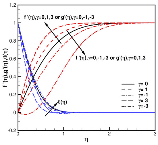 The analysis and discussion of results obtained using HAM is as follows. The analysis involves a discussion of the impact of many physical parameters generated in the proposed model. When γ = 0, , and σ = 0, it can be found that represents the axisymmetric Homann stagnation-point flow. When γ = 0 (axisymmetric), (regular fluid), and (non-porous medium), = 1.311608, compared with the = 1.311938 of Waini et al. [40], Wang [63], and Soid et al. [64], and the relative error is not more than 0.025%. Table 3 presents a comparison of corresponding values of and with γ, , σ. A 20th order homotopy solution is adopted without higher order calculation, and the convergence result is accurate enough, especially for the large values of γ, , and σ. As shown in Table 3, skin friction coefficients and Nusselt number with various values of γ, , σ when Pr = 6.2 are calculated and compared with the results of Waini et al. [40]. The consistency of results is very good. When Pr = 6.2, σ = 0, and the volume fraction , the velocities of and the temperature distributions under different values of shear-strain rate ratios γ = 0, ±1, ±3 are presented in Figure 2. The behaviors of flow fields by changing the shear–strain rate ratios γ are studied. When , increase with an increase in γ; decreases with an increase in γ. When , decrease as γ decreases; decreases with the decrease in γ generally. flows in the reverse direction towards the plate at , or flows in the reverse direction towards the plate at γ = 3. Flows are inward near the stagnation zone, as shown in Figure 3. When Pr = 6.2 and , the velocities of and the temperature curves with different γ and σ values are shown in Figure 4a,b. , increase as σ increases. When the volume fraction of spherical hybrid nanoparticles Cu-Al2O3-H2O increases, the coefficients of skin friction and local Nusselt numbers increase. The Prandtl number is fixed at 6.2, and does not consider the variations.