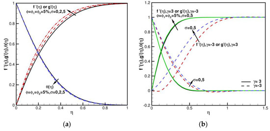 The skin friction coefficients of for various γ, , and σ when Pr = 6.2. (a) Impact of σ = 0, = 0, 5%, 10%, 20%; (b) Impact of = 5%, σ = 0, 1, 2, 5.