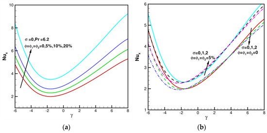 Figure 6a,b illustrates that variations in local Nusselt number against γ in the range of for various , 5%, 10%, 20%, and σ = 0, 1, 2 when Pr = 6.2. As shown in Figure 3a, when , 5%, 10%, 20%, σ = 0, and Pr = 6.2, increases as the value of increases. When γ < 0, the values of increase steeply with volume fractions increasing. When γ > 0, the values of increase and slow down with volume fractions increasing. When = 0, 5%, and Pr = 6.2, against γ in the range of for various σ = 0, 1, 2 are shown in Figure 5b. As increase, the values of increase. When γ < 0, values of decrease and change clearly with σ increasing. When γ > 0, values of are less affected by the values of σ.