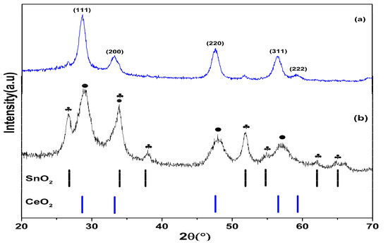 Electrospinning is a simple and versatile technology that uses electrostatic repulsion between surface charges to extract nanofibers from a viscoelastic fluid and can be used for a variety of materials [56]. In the present study, it was utilized successfully to make composite NFs with diameters as small as hundreds of nanometers. The XRD configuration of CeO2 and CeO2−SnO2 NFs after calcination at 500 °C are displayed in Figure 1. Specifically, all of the reflection crests in Figure 1a were assigned to the cubic fluorite structure of CeO2 (JCPDS no. 65-2975) at angles of 28.5°, 33.2°, 47.5°, 56.4°, and 59.1°, which relate to the (111), (200), (220), (311), and (222) crystal planes, respectively [26]. A small peak was observed at 52.5°, which was probably the peak of Ce(OH)3 [57]. In the XRD configuration of CeO2−SnO2 (Figure 1b), major diffracted crests identical to those of CeO2 NFs were visualized. Additionally, diffraction peaks from the tetragonal SnO2 (JCPDS card no. 41-1445) were also observed [58], which demonstrates the effective materialization of CeO2−SnO2 composite NFs. No other mixes of Ce and Sn were detected using XRD.