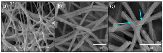 The arrows clearly show the characteristic sheath on the composite NFs, which was due to the presence of SnO2 (Figure 2c). The different salt content significantly increased the solution conductivity, resulting in thinner electrospun fibers. Due to increased spinnability in the presence of Ce and Sn precursors, uniform nanofibers were generated. Consequently, it was observed that a different salt addition had a considerable impact on the spinnability of the polymer solution. Additionally, because of the increased conductivity, the electric field accelerated the ions and the interactions between the polymer and the salt resulted in a less compact polymer structure. Our findings show that when salt (Ce and S) ions were propelled by an electric field, the polymer chain followed the ions’ motion, thereby decreasing the fiber diameter size. Analogous studies were reported for polymeric fibers by electrospinning in the presence of salts [59,60].