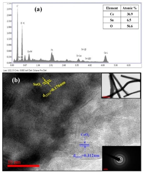 (a) EDX spectra and (b) HR-TEM image of the prepared CeO2−SnO2 composite NFs (the inset shows a low-resolution image and SAED pattern).