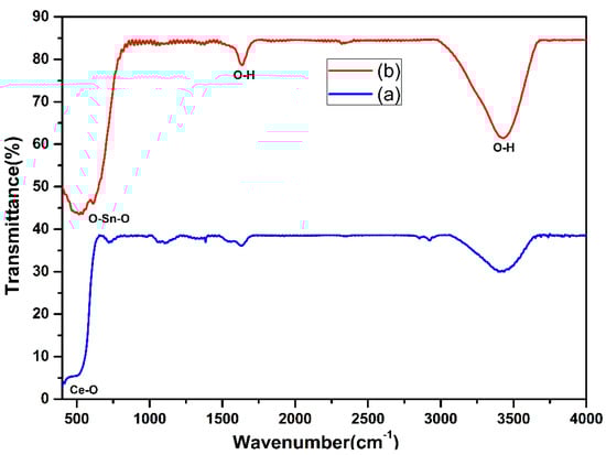 Figure 4 displays the FT-IR bands of the virgin CeO2 and composite CeO2−SnO2 NFs. The existence of a strong band prior to 600 cm−1 could be assigned to the Ce-O-Ce stretching vibration [61] (Figure 4a). Both spectra revealed bands around 3450 cm−1 and 1637 cm−1 conforming to O–H widening vibration of the remaining water molecules and hydroxyl clusters. In the nanocomposite NFs spectra (Figure 4b), the occurrence of a band at 610 cm−1 corresponded to the stretching mode of SnO2 [62]. The presence of both CeO2 and SnO2 peaks suggested the integration of these materials in the final composite NFs.