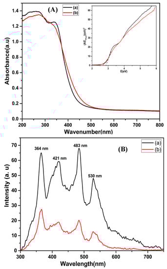 From the inset in Figure 5A, the calculated band gaps of the CeO2 NFs and CeO2−SnO2 composite were found to be 2.87 eV and 2.67 eV, respectively. This means that the smaller band gap of CeO2−SnO2 composite NFs will harness more visible light than CeO2 NFs. These results are consistent with an earlier report [63]. The PL emission spectra of the CeO2 and CeO2−SnO2 composite samples were documented using an excitation wavelength (Figure 5B). The PL spectrum of CeO2 had prominent peaks at 364, 421, 483, and 530 nm [64,65,66]. Moreover, the CeO2−SnO2 composite showed weaker emission peaks than CeO2, indicating a lower recombination frequency of the photogenerated electron–hole pair.