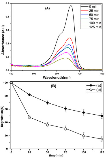 (A) Absorption spectra of MB dye using CeO2-SnO2 composite NFs for different periods and (B) relative photocatalytic action of (a) CeO2 and (b) a CeO2-SnO2 nanocomposite for MB dye.