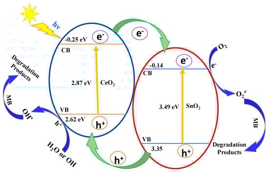 The photoexcited electrons are transported to the SnO2, as the conduction band (CB) position of CeO2 is more negative than SnO2. Meanwhile, the transported electrons in the CB of SnO2 will interact with dissolved oxygen molecules to generate superoxide radical anions (O2−). The superoxide radicals react with water and produce hydroperoxide radicals (HO2) and hydroxyl radicals (OH). Subsequently, the holes on the valence band (VB) of SnO2 migrate to the VB of the CeO2 since the valence band potential of CeO2 is more negative than that of SnO2. Simultaneously, the generated h+ can oxidize water molecules to produce OH. These radicals have a strong ability to degrade dye molecules (Figure 8). The MB dye is photo-oxidized into carbon dioxide and water molecules or inorganic ions as degradation products [63].