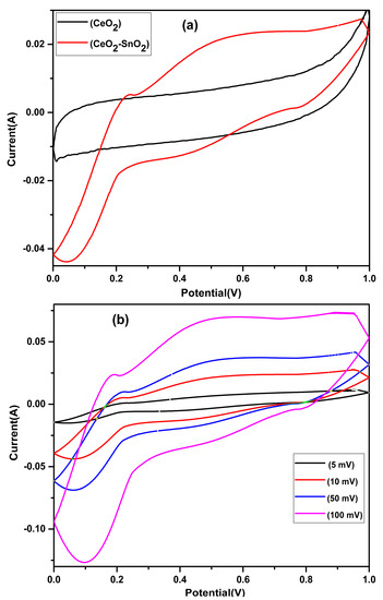 Figure 9A demonstrates the cyclic voltammograms (CVs) of the pure CeO2 NFs and CeO2−SnO2 NFs. The CeO2−SnO2 composite NFs indicated higher current values and better voltammetric shapes compared with pure CeO2. The CeO2−SnO2 composite exhibited improved specific capacitance (413.9 Fg−1) compared with the CeO2 NFs (263.9 Fg−1) at a scan rate of 10 mV/s. No redox peaks were observed in the CV of the bare CeO2 NFs, which might have been due to the reason that there was little or no oxidation–reduction (corrosion or degradation) process going parallel to the double-layer charging. The presence of redox peaks in the CeO2−SnO2 composite NFs indicates that reversible and incessant faradaic oxidation–reduction responses were involved during the charging and discharging procedure [75,76]. It can be assumed that the electrochemical performances of composites were enhanced due to the synergistic effect between CeO2 and SnO2. Figure 9B shows the CV curves for different scan rates for the CeO2−SnO2 composite. The CeO2−SnO2 composite NFs confirmed elevated specific capacitance values of 413.9, 294.94, 147.6, and 16.1 F/g at scan rates of 5, 10, 50, and 100 mVs−1, correspondingly.