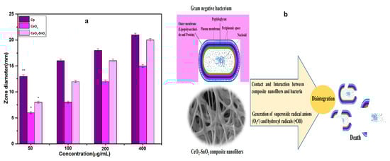 (a) E. coli susceptibility to CeO2 NFs and CeO2−SnO2 composite NFs (50–400 µg/mL). Ciprofloxacin was used as the standard antibiotic. The data are given as mean values and standard deviations of three replicates. * p < 0.005 and ** p < 0.01 vs. control. (b) Pictorial illustration of bacterial death and disintegration.