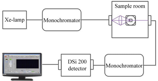 The phase and the crystal structure of powders were identified by an X-ray diffractometer (XRD, MiniFlex 600, Rigaku, Tokyo, Japan) using Cu Kα radiation. Morphologies of the powders were analyzed by a field emission scanning electron microscope (SEM, JSM-7800F, JEOL, Tokyo, Japan) equipped with energy dispersive spectroscopy (EDS, X-MaxN 50, Oxford, Oxford, UK) using an accelerating voltage of 15 kV. Particle size distributions were measured in a Nanoparticle Analyzer (Zetasizer Nano-ZS, Malvern, UK). Photoluminescence (PL) spectra were recorded using a Keithley 2010 multimeter and the monochromator (λ500, Zolix, Beijing, China) equipped with a Si detector (DSi200, Zolix, Beijing, China). A commercial Xe lamp and two solid-state lasers emitting at 266 nm and 532 nm were used as the excitation sources for different excitation wavelengths. A standard PTFE diffuse reflective white plate (reflectivity greater than 99.9%) was used as a reference. The schematic diagram of the experimental setup is depicted in Figure 2. The relative spectral power distribution was obtained and calibrated by the Optical Power Meter (1830-C, Newport, Newport County, RI, USA). All measurements were performed at room temperature.