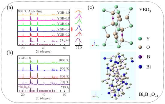 Figure 3a shows the XRD patterns of YGB phosphors with different compositions annealed at 800 °C, the main peaks of which are in agreement with the JCPDS Card of YBO3 (PDF#16-0277). The phosphors were confirmed as polycrystalline materials that possess a hexagonal crystal structure with space group P63/m and the cell parameters of a = b = 3.778 Å and c = 8.81 Å, similarly to what has been previously reported [20]. Moreover, the well-defined sharp diffraction peaks imply that these samples have high crystallinity, illustrating that Gd3+ and Bi3+ ions are substituted within the host. Some small impurity peaks are identified as Bi6B10O24 (PDF#29-0228), which are attributed to the interaction of Bi2O3 and excess H3BO3 during the fabrication process [21]. The corresponding reaction equation is as follows: 2Bi2O3 + B2O3→Bi4B2O9 and 3Bi4B2O9 + 7B2O3→2Bi6B10O24 [22]. Here, the XRD peaks (2θ = ~27.2°) of YGB samples with slightly smaller angles, in comparison with the standard YBO3, should be attributed to the larger radius of Gd3+ (1.053 Å, 8-coordination) and Bi3+ (1.170 Å, 8-coordination) relative to that of Y3+ (1.019 Å, 8-coordination), according to Bragg’s law [23,24,25], while the shift in diffraction peaks resulted from the different Gd3+-Bi3+ contents in these phosphors. The slight change is also attributed to the surface charge redistribution of the crystal nucleus, induced by an inner-electron charge transfer between the doped ions and lattice cations [26,27]. Therefore, these results show that doped Gd3+ and Bi3+ ions do not affect the main crystal structure of YBO3 and should be completely dissolved into the host lattice.