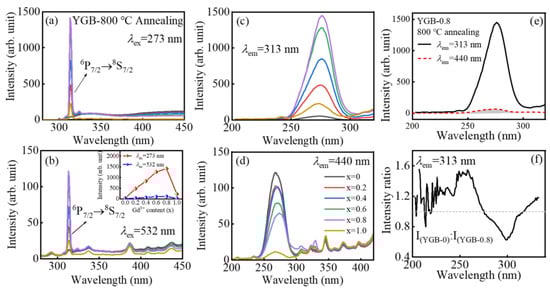 PL spectra of YGB phosphors (x = 0, 0.2, 0.4, 0.6, 0.8, and 1.0) under the (a) 273 nm and (b) 532 nm excitations, and their PLE spectra monitoring at (c) 313 nm and (d) 440 nm. Inset in (b): The dependence of PL emission intensities at 313 nm on the Gd3+ content (x) in YGB phosphors under 273 nm and 532 nm excitations. (e) Excitation spectra of YGB-0.8 phosphor with the spectral overlap presented by the shade and (f) the fluorescence intensity ratio of the 800 °C annealed YGB-0.8 and YGB-0 phosphors monitored at 313 nm.