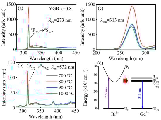 PL spectra of YGB-0.8 phosphors annealed from 700 °C to 1000 °C under (a) 273 nm and (b) 532 nm excitations. (c) Their PLE spectra monitored at 313 nm and (d) the schematic energy transfer mechanism from Bi3+ to Gd3+ ions.